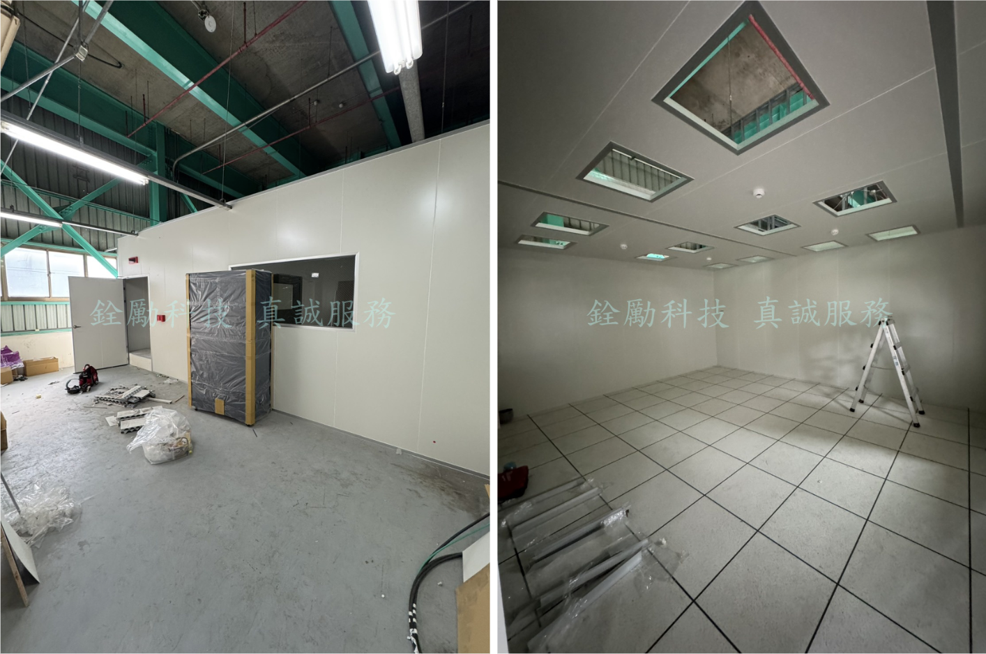 在經過業務初步的工程現勘、施工討論、工程排程後就輪到工程團隊進場,機房周圍隔間由於空間遼闊非常迅速施工完成,IT機房不同於一般空間,其環境控制需求極高,包括溫度穩定、濕度控制、潔淨度、靜電防護與防火安全等。相對的庫板天花板更符合相對規範,庫板內部填充PU(聚氨酯),可有效隔絕室內外溫度變化,協助冷氣系統穩定運作,維持伺服器運作所需的低溫環境,提升能源效率,由於業主不希望看到天花板上的螺桿懸掛在上方相當的不美觀,由於天花板空間超過6米3工程團隊使用了雙向C型鋼來增加天花板的結構強度,庫板隔間具有良好隔音性能,可降低伺服器風扇、冷氣系統等運轉噪音,創造更舒適的工作與維護環境。